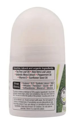 Dr.Organic Tea Tree Deodorant Roll On is suitable for vegans and is natural effective way to protect from the bacteria which cause body odour and to deodorise the skin without harsh chemicals. It contains extract from tea tree leaf, aloe vera leaf, icelandic moss, sunflower seed and peppermint. This odour fighting formulation is easily absorbed and gives a natural refreshing sensation to keep you feeling fresh and clean. Combining Aloe Vera leaf juice with tea tree essential oil and peppermint essential oil so you can stay fresh using nature’s most effective plant based formulas