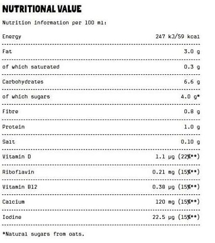 Oat base (water, oats 10 %), rapeseed oil, acidity regulator (dipotassium phosphate), calcium carbonate, calcium phosphates, iodized salt, vitamins (D2, riboflavin, B12)